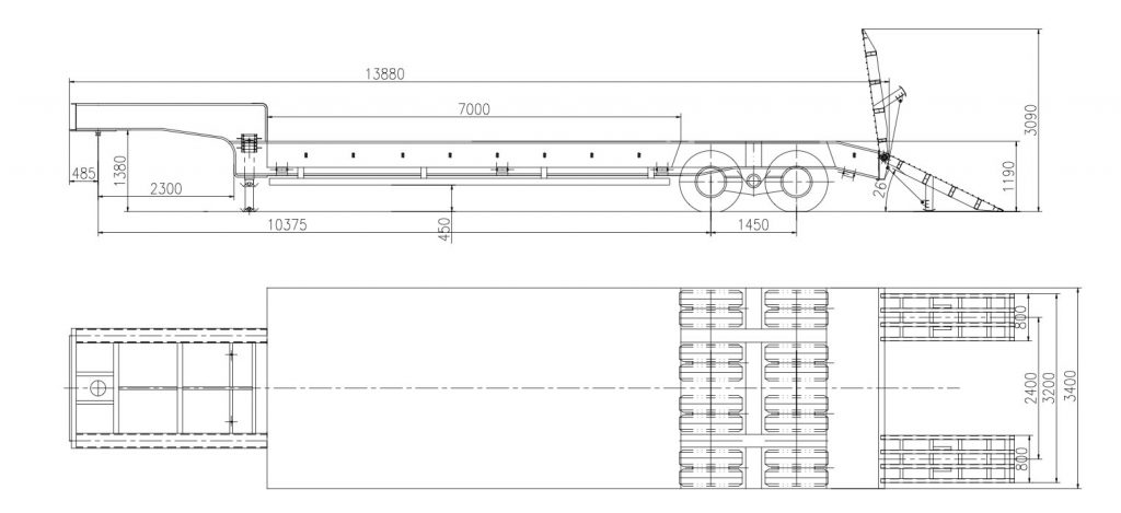 We are one of the leading professional lowboy trailer manufacturers, our featuring low bed trailer for sale are welded by longitudinal beam, side beam and crossbeam. Steal grade Q460 which will not deform until intension reaches 460Mpa. This kind of steel has features of high strength, various temperature ductility, low yield ratio and high elongation. Axles of the lowboy is non driving type, hubs, drum brakes, rims and tires are fixed on each side. Bogie are provided with balance suspension which faciliates the steering during road duty, during which all axles match with the bumping of roads, balancing the loads on the lowboy deck. It’s an ideal choice for heavy load duty, especially military forces, in tough road condition.